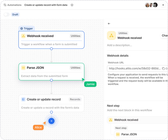 For example, you can use the Webhook received, Parse JSON, and Create or update record blocks to extract data from a form submission, and then create or update a record with the data encoded in the form.